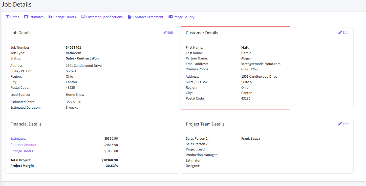 Customer details in Remodel Cloud bring all your client information into one organized view, contacts, project history, preferences, and communication.
