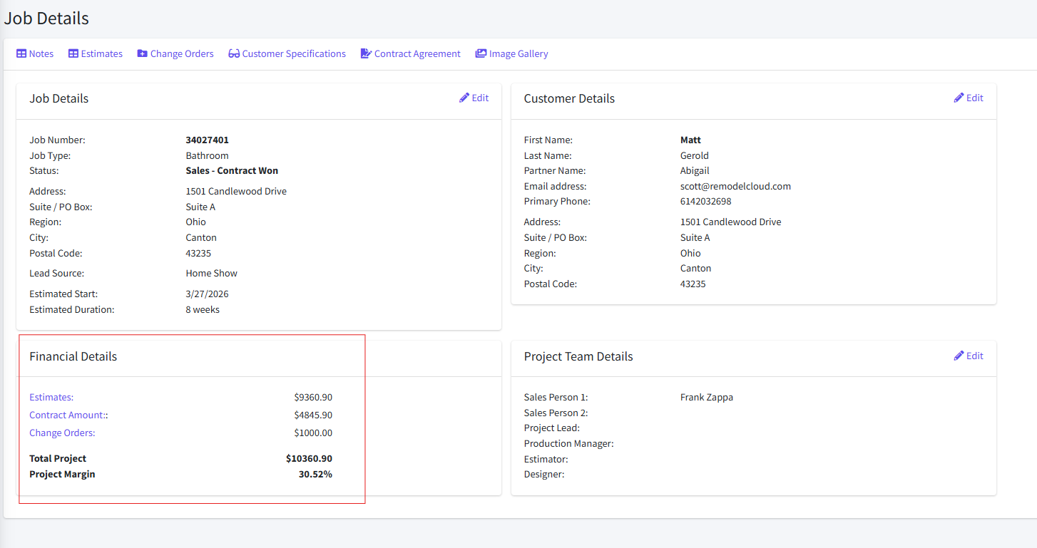Financial tracking in Remodel Cloud gives you real-time visibility into estimates, contracts, change orders