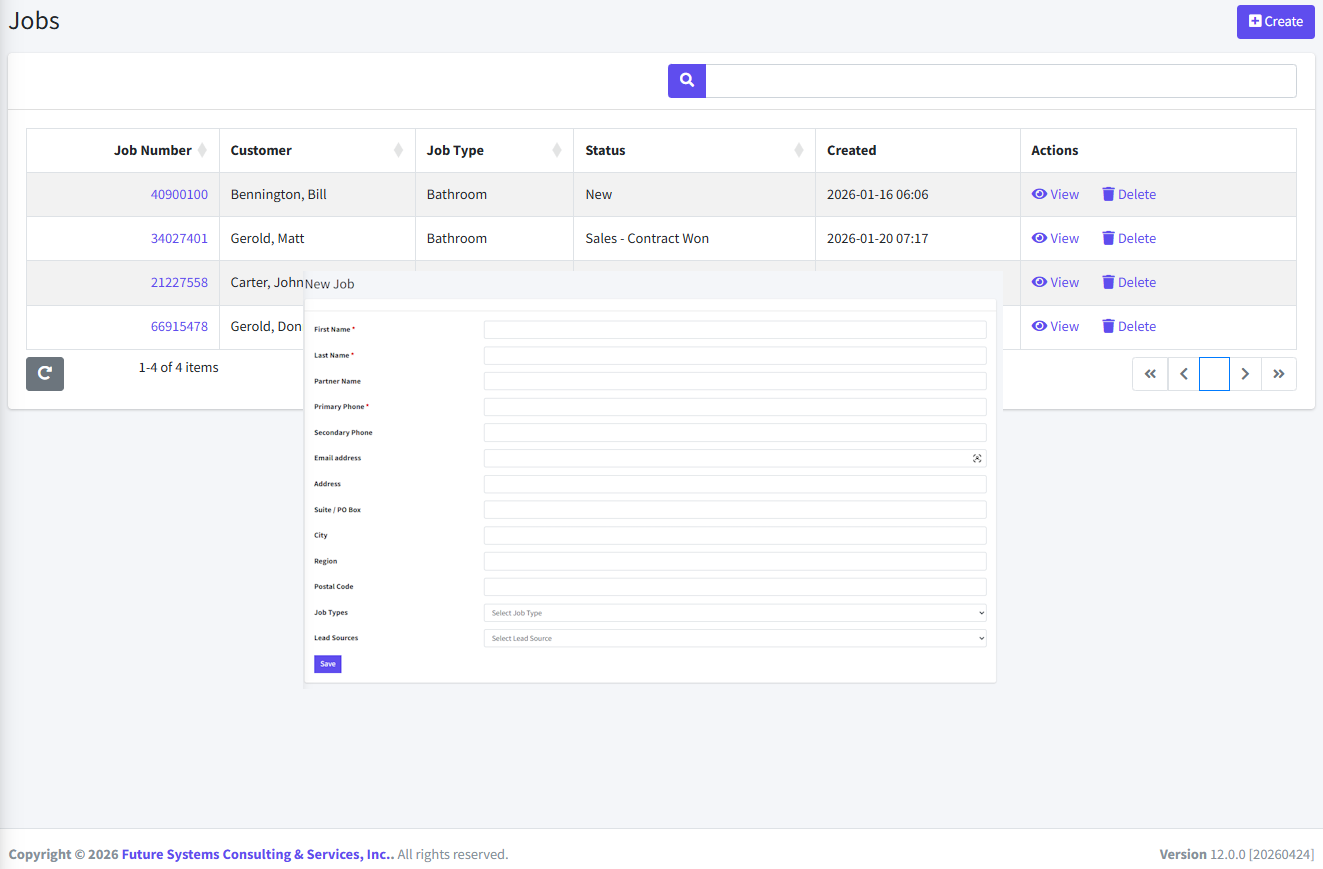 Create new leads quickly by entering prospect contact details, job information, lead source, and project notes.